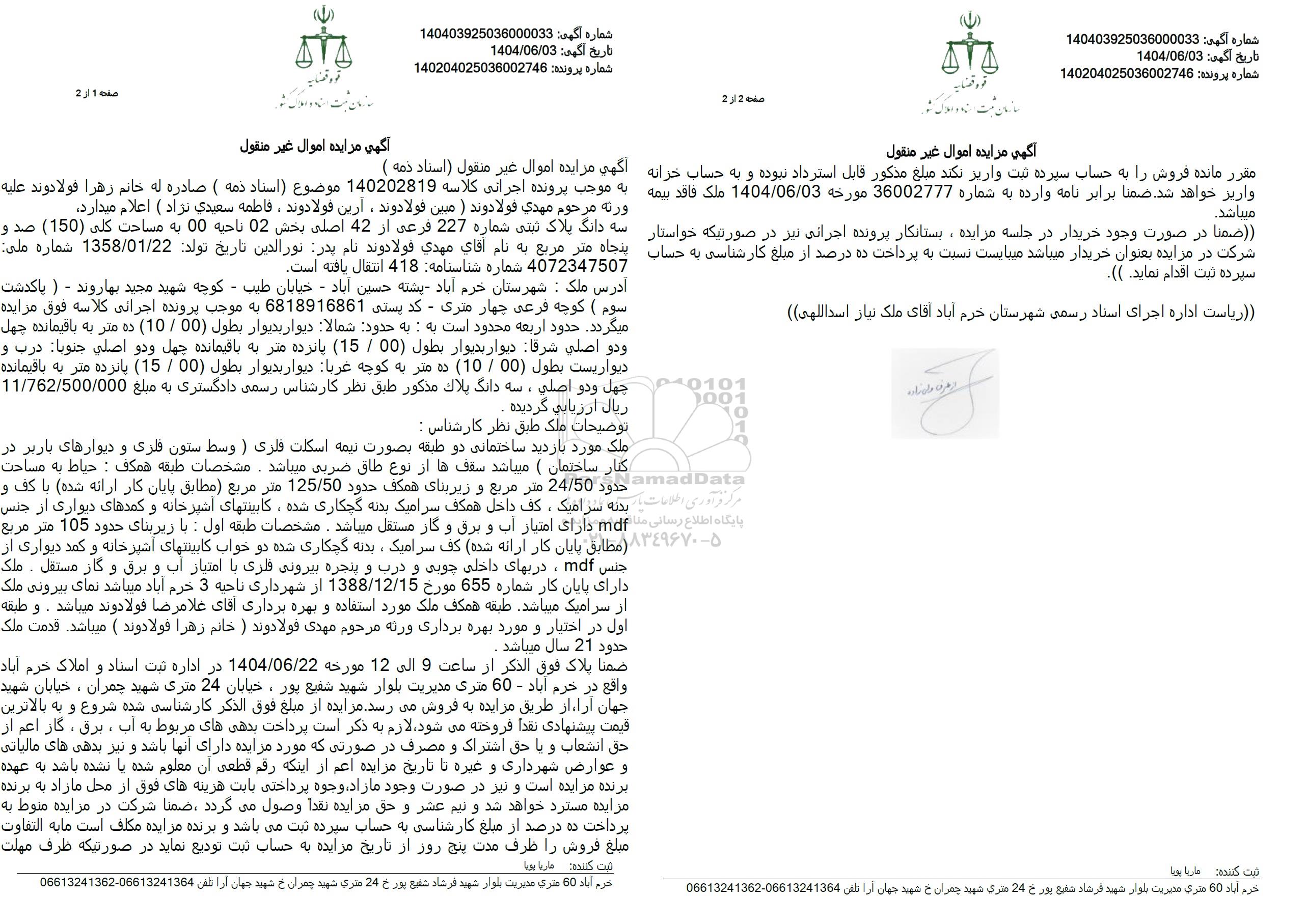 مزایده فروش سه دانگ از ششدانگ ملک با مساحت 150 مترمربع با پلاک ثبتی 227 فرعی از 42 اصلی, مزایده فروش سه دانگ از ششدانگ ملک با مساحت 150 مترمربع با پلاک ثبتی 227 فرعی از 42 اصلی