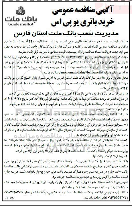 آگهی مناقصه عمومی خرید باتری یو پی اس از کلیه افراد متخصص و شرکتها واجد شرایط دعوت به عمل میآید در مناقصه با کد خبرگزاری پارس نماد: 9453537 شرکت نمایند.