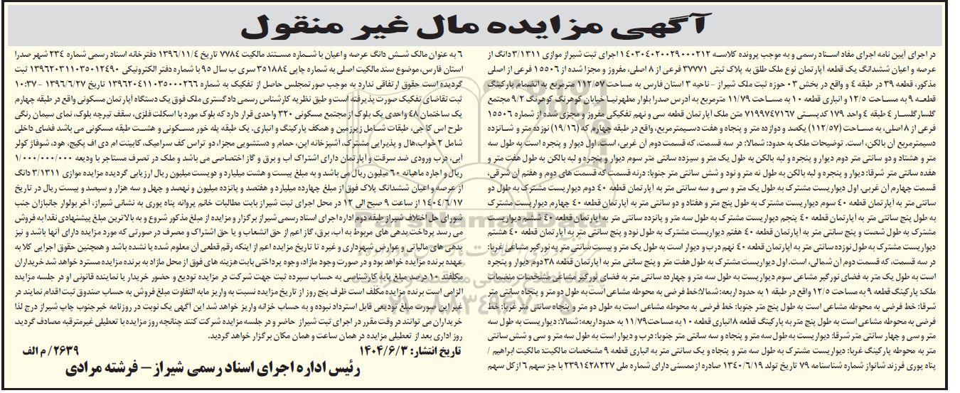 موضوع مزایده: یک قطعه آپارتمان تحت پلاک ثبتی 37771 فرعی از 8 اصلی مفروز و مجزی شده از 15506 فرعی از اصلی مذکور به ارزش چهارده میلیارد و هفتصد و پانزده میلیون و نهصد و چهل و سه هزار و سیصد و بیست ریال ریال