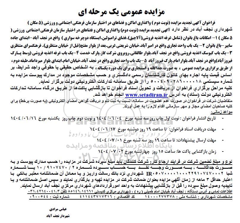 شهرداری نجف آباددر نظر داردآگهی تجدید مزایده (نوبت دوم) واگذاری اماکن و فضاهای در اختیار سازمان فرهنگی اجتماعی ورزشی ( 5 مکان ) 1- امکانات باغ بانوان (شامل غرفه اغذیه فروشی(آلاچیق).فضای ترامبولین.ایستگاه دوچرخه سواری ) واقع در نجف آباد-ابتدای جاده سابیر-باغ بانوان 2-یک باب واحد تجاری واقع در امیرآباد.خیابان شریعتی غربی.بعد از بلوار مفتح(قبل از خیابان منتظری). فرهنگسرای منتظری 3-یک باب کیوسک اغذیه فروشی واقع در نجف آباد.بلوار طالقانی.روبروی شرکت گاز.پارک خدمت 4-یک باب غرفه اغذیه فروشی (وسط پارک فیروزآباد)واقع در نجف آباد.بلوار امام.پارک فیروزآباد 5-یک باب واحد تجاری واقع در نجف آباد.خیابان امام.ابتدای بلوار میرداماد.طبقه دوم، از طریق برگزاری مزایده عمومی ، به صورت جداگانه و استیجاری برای یک دوره یکساله ،به اشخاص حقیقی یا حقوقی واجد شرایط، بر اساس قیمت پایه اجاره بهای کانون کارشناسان رسمی دادگستری و حسب مشخصات موجود در مدارک پیوست مزایدهبه شمارهسیستمی 5004090286000018 را از طریق سامانه تدارکات الکترونیکی دولت برگزار نماید.