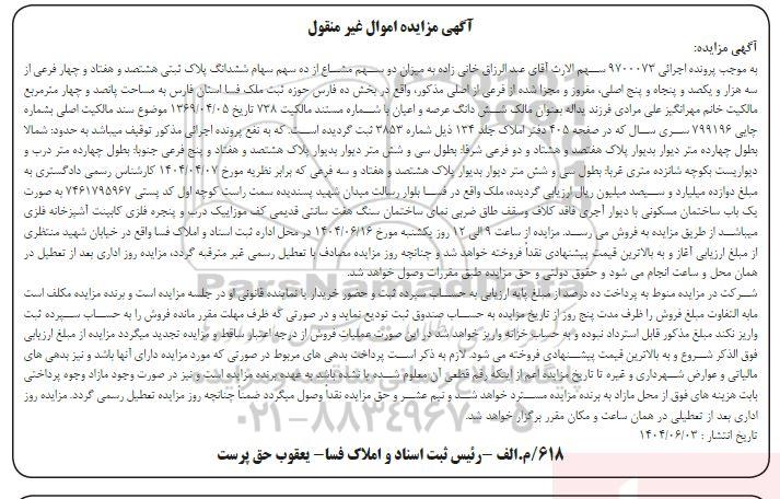 موضوع مزایده: مزایده دو سهم مشاع از ده سهم سهام ششدانگ پلاک ثبتی هشتصد و هفتاد و چهار فرعی از سه هزار و یکصد و پنجاه و پنج اصلی، مفروز و مجزا شده از فرعی از اصلی مذکور، واقع در بخش ده فارس حوزه ثبت ملک فسا استان فارس به مساحت پانصد و چهار مترمربع به مبلغ دوازده میلیارد و سیصد میلیون ریال