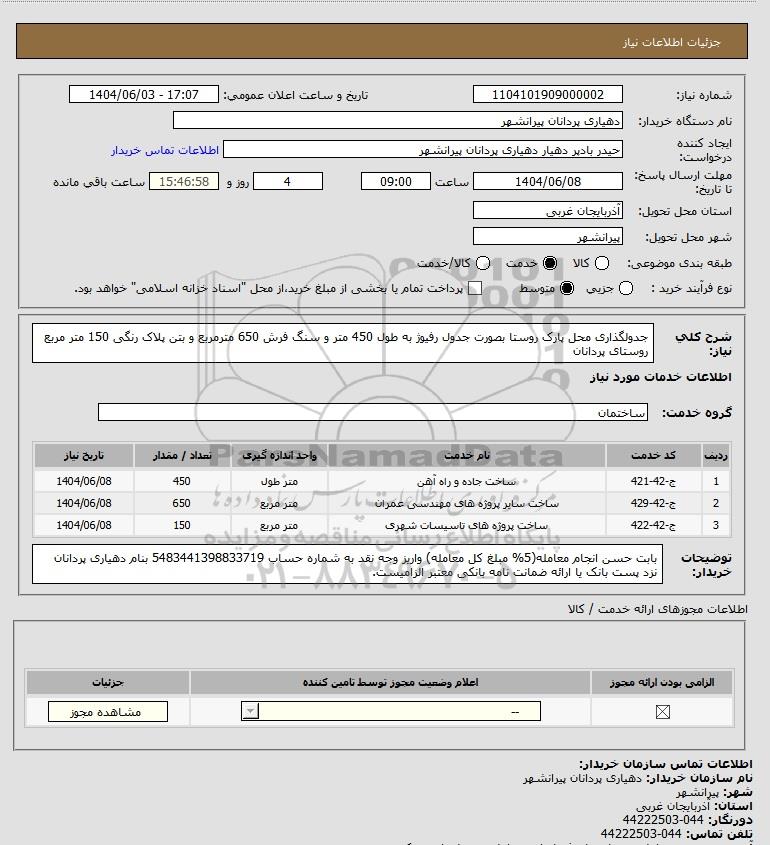 شرح کلی نیاز: جدولگذاری محل پارک روستا بصورت جدول رفیوژ به طول 450 متر و سنگ فرش 650 مترمربع و بتن پلاک رنگی 150 متر مربع روستای پردانان