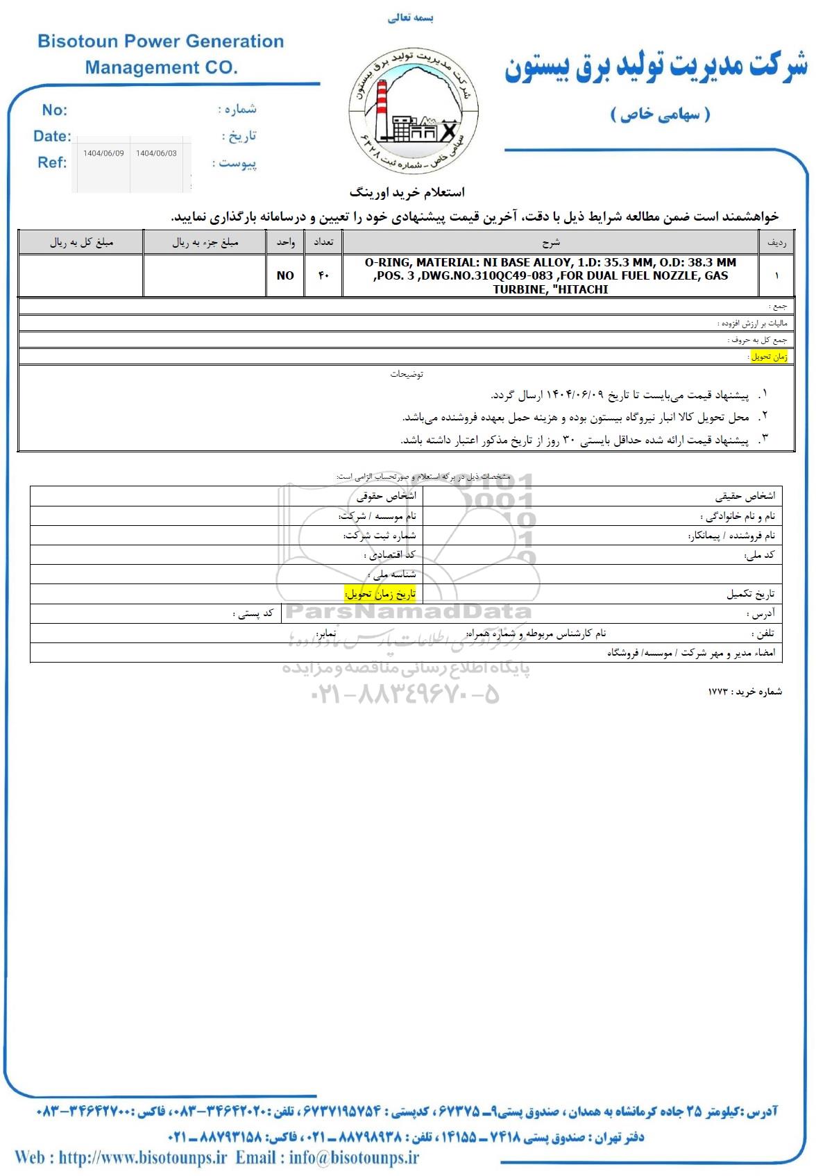 استعلام بها و موضوع استعلام استعلام خرید اورینگ به اطلاع کلیه شرکتها و افراد متخصص واجد شرایط میرساند، آگهی گذار در نظر دارد از طریق استعلام بها، نسبت به انتخاب و دریافت پیشنهادات اقدام نماید. این استعلام با کد آگهی ثبت شده در سامانه خبرگزاری پارس نماد : 9453725 منتشر شده است. مشخصات استعلام : تاریخ شروع استعلام: 1404/06/03 آخرین مهلت ارسال پیشنهاد قیمت : 1404/06/09 و محل اجرای پروژه : استان کرمانشاه میباشد. استعلام قیمت مورد درخواست : استعلام خرید اورینگ با دستهبندیهای تخصصی و گروه های مرتبط : انواع توربین های بادی و آبی و غیره, قطعات لاستیکی, لوله و اتصالات, نیروگاه, تجهیزات برق و الکترونیک, استعلام اطلاع رسانی میگردد. شرایط شرکت در استعلام آنلاین : ابتدا ثبت نام در سامانه استعلام پارس نماد و تکمیل مدارک موردنیاز و بارگذاری در سامانه رعایت تمامی ضوابط و الزامات مندرج در اسناد استعلام است.