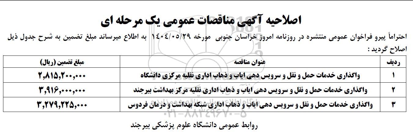احتراما پیرو فراخوان عمومی منتشره در روزنامه امروز خراسان جنوبی مورخ 1404.5.29 به اطلاع می رساند مبلغ تضمین به شرح جدول ذیل اصلاح گردید