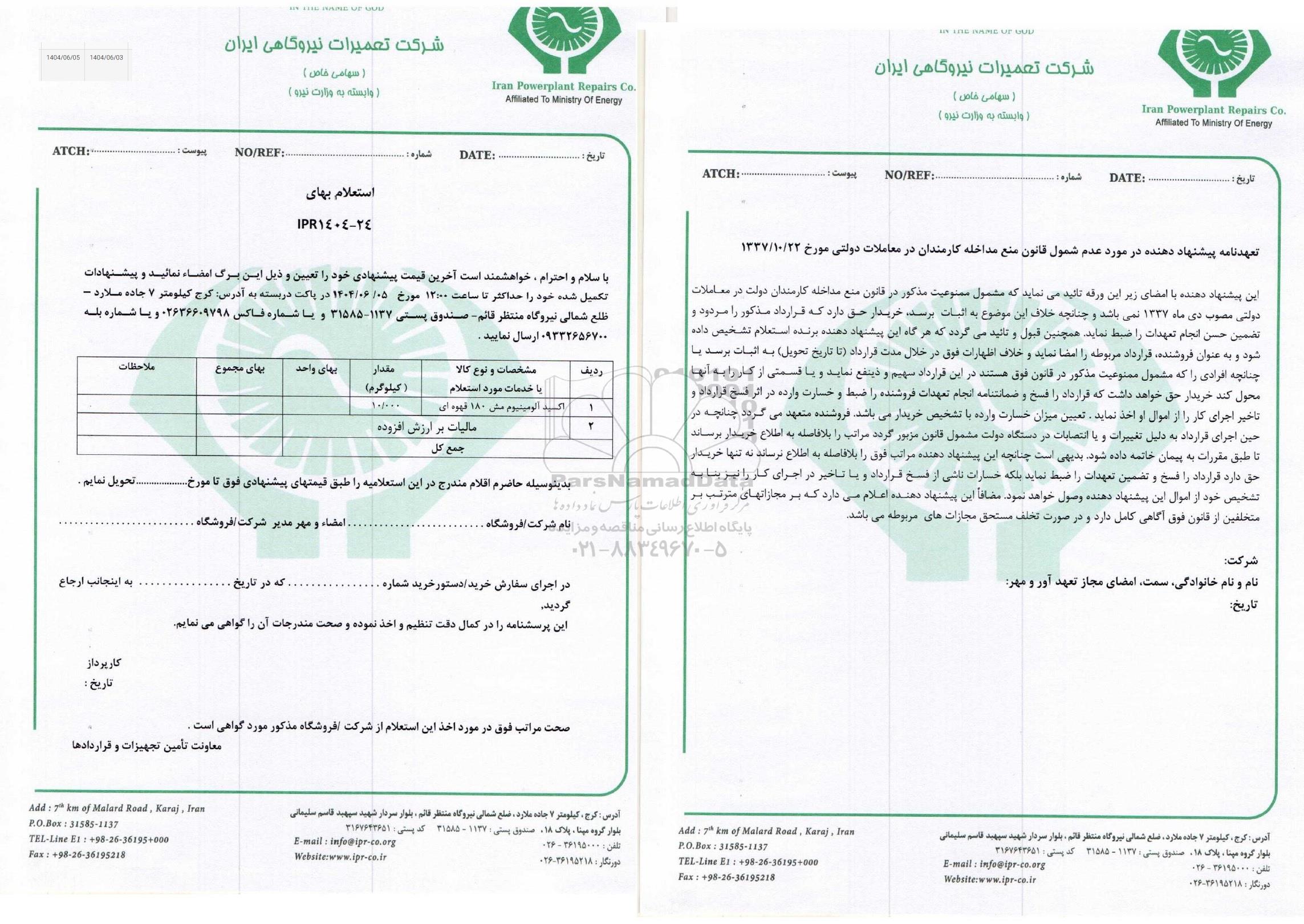 با سلام و احترام، خواهشمند است آخرین قیمت پیشنهادی خود را تعیین و ذیل این برگ امضاء نمائید و پیشنهادات تکمیل شده خود را حداکثر تا ساعت 12 مورخ 1404.6.5 در پاکت دربسته به آدرس کرج کیلومتر 7 جاده ملارد -ظلع شمالی نیروگاه منتظر قائم - صندوق پستی 1137-31585 و یا شماره فاکس 02636609798 و یا شماره بله 09332656700 ارسال نمایید .