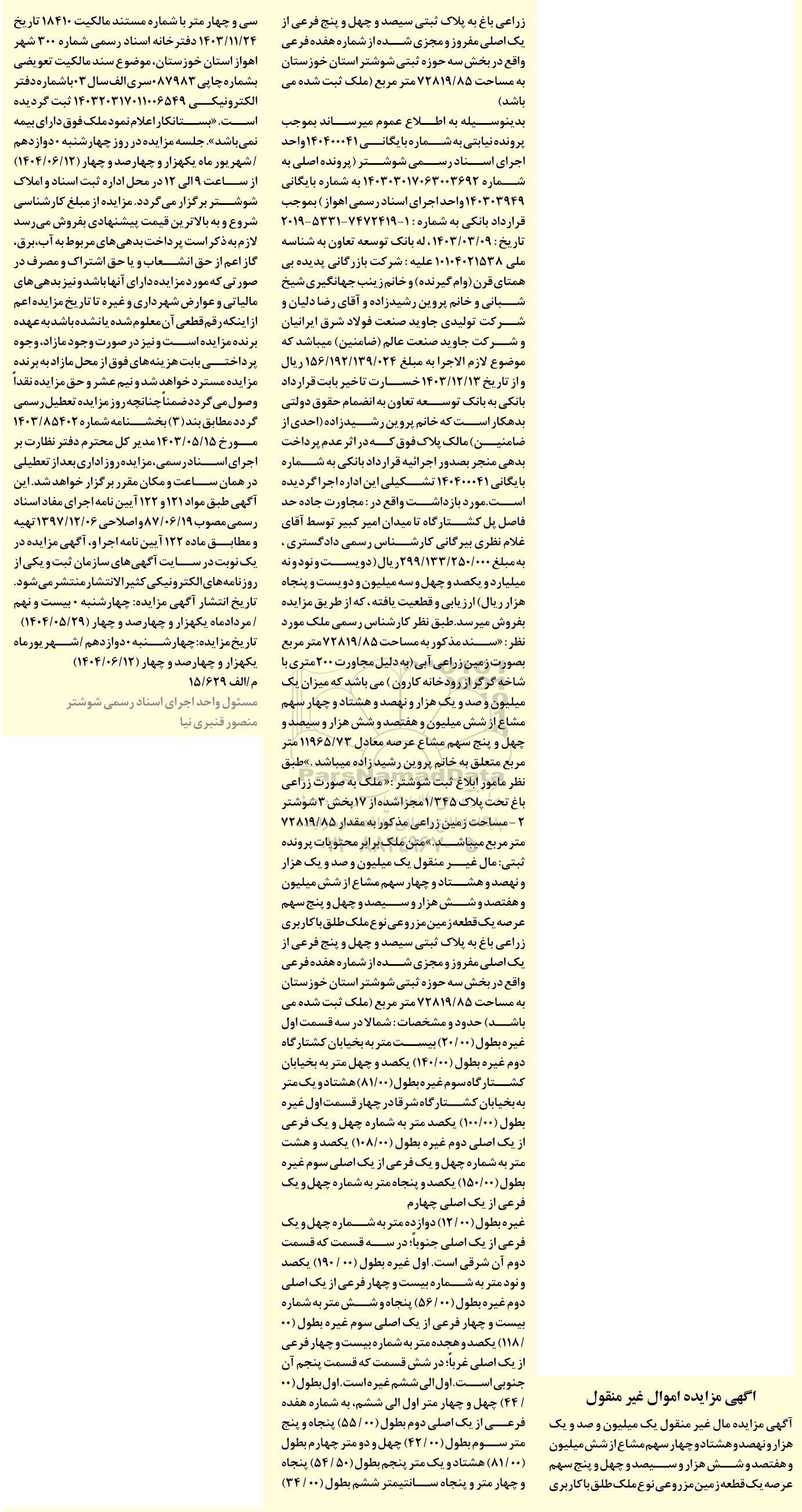 موضوع مزایده :مزایده یک قطعه زمین مزروعی نوع ملک طلق با کاربری زراعی باغ به پلاک ثبتی سیصد و چهل و پنج فرعی از یک اصلی مفروز و مجزی شده از شماره هفده فرعی واقع در بخش سه حوزه ثبتی شوشتر استان خوزستان به مبلغ 299.133.250.000 ریال