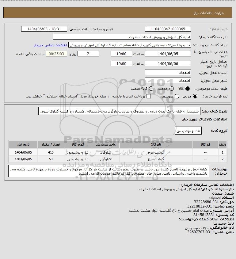 شرح کلی نیاز: شنیسل و فیله باریک بدون چربی و غضروف و ضایعات.بارگرم درجه1شمالی کشتار روز قیمت گذاری شود.