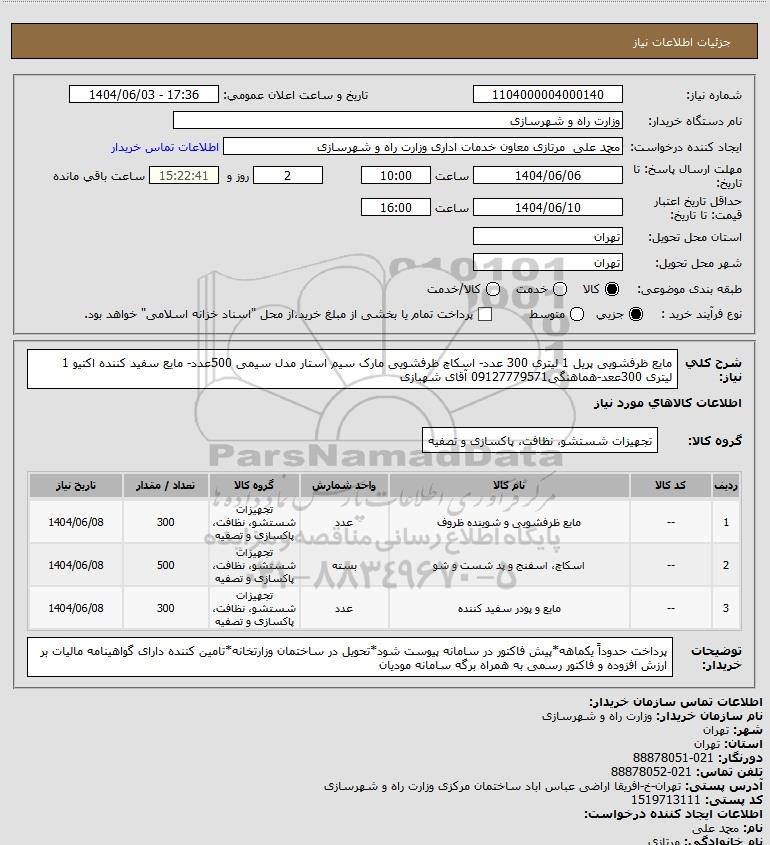 شرح کلی نیاز: مایع ظرفشویی پریل 1 لیتری 300 عدد- اسکاچ ظرفشویی مارک سیم استار مدل سیمی 500عدد- مایع سفید کننده اکتیو 1 لیتری 300ععد-هماهنگی09127779571 آقای شهبازی
