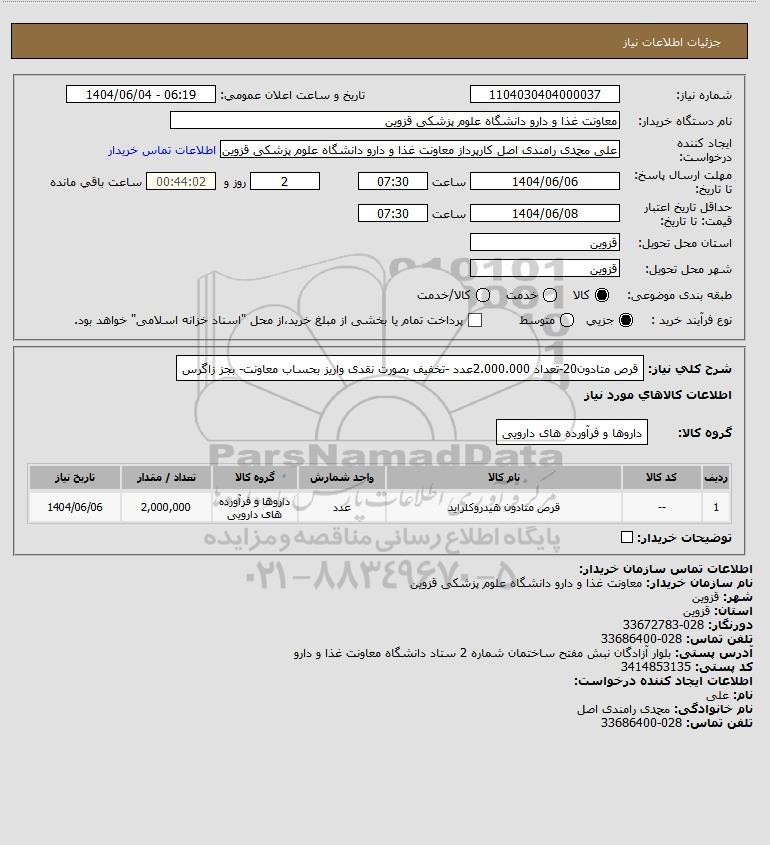 شرح کلی نیاز: قرص متادون20-تعداد 2.000.000عدد -تخفیف بصورت نقدی واریز بحساب معاونت- بجز زاگرس