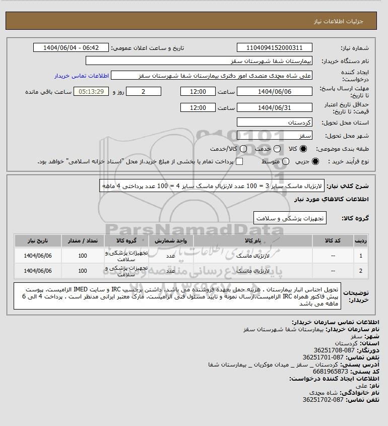نام دستگاه خریدار:بیمارستان شفا شهرستان سقز