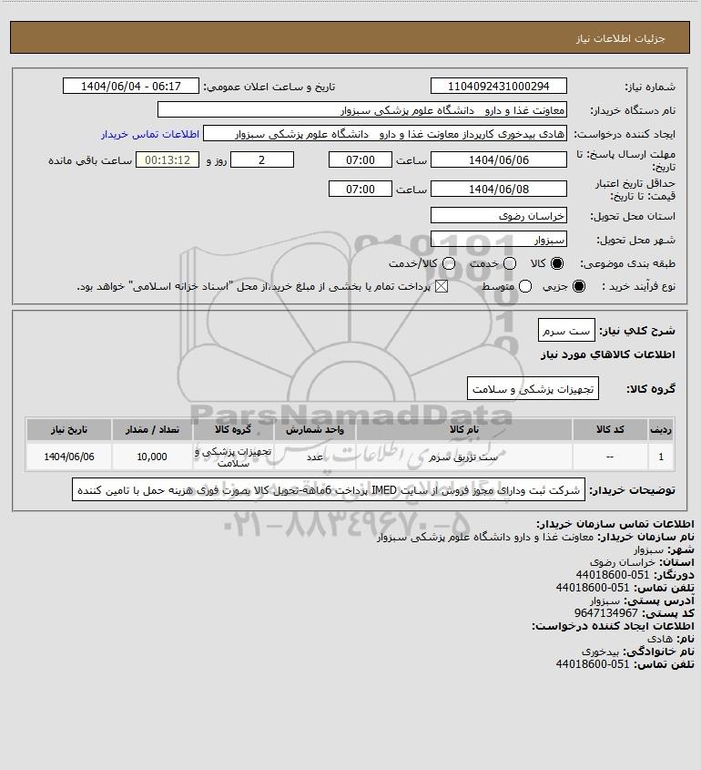 | 1 | -- | ست تزریق سرم | عدد | تجهیزات پزشکی و سلامت | 10,000 | 1404/06/06 |