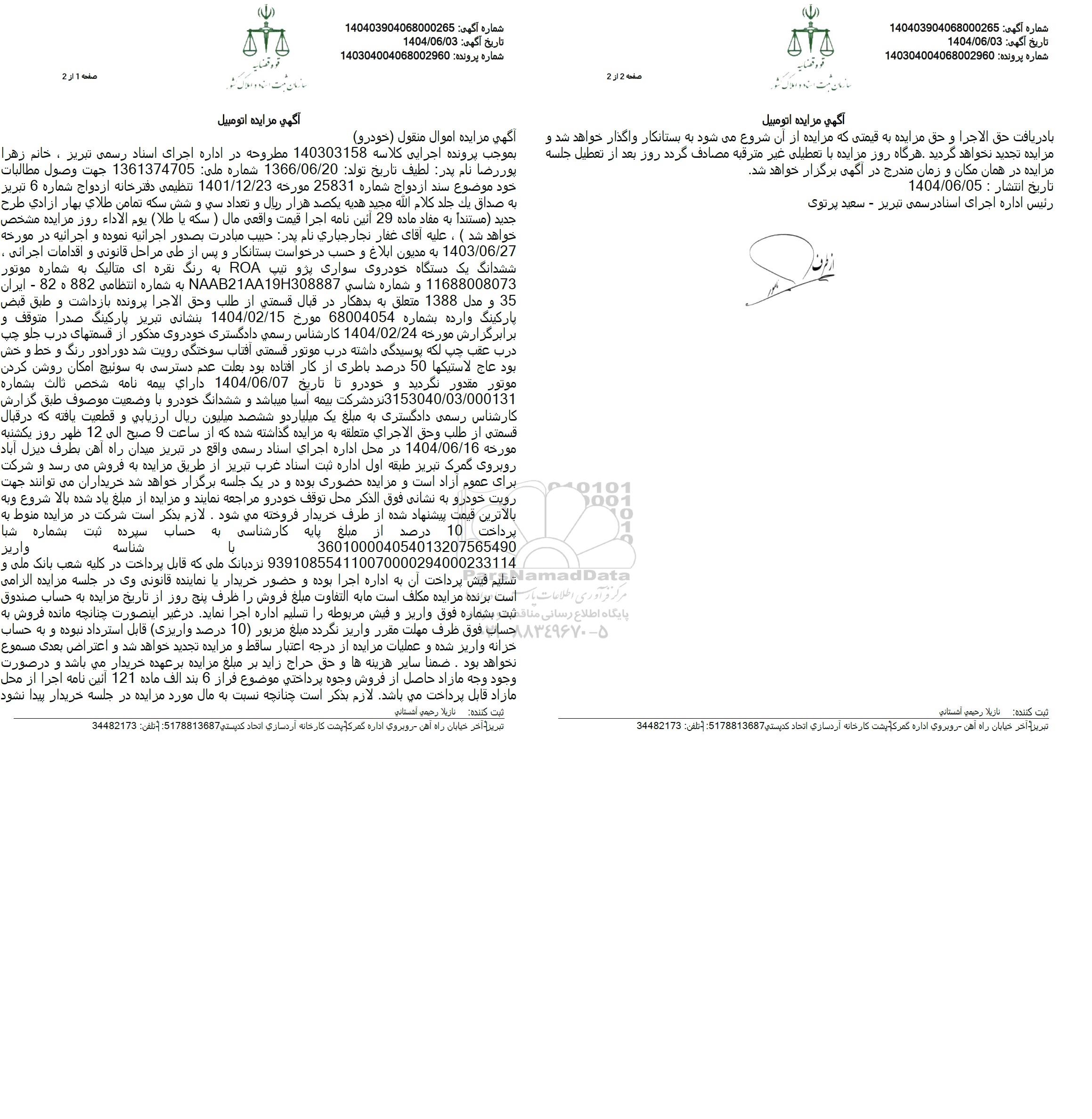 مزایده ششدانگ یک دستگاه خودروی سواری پژو تیپ roa نقره ای, مزایده ششدانگ یک دستگاه خودروی سواری پژو تیپ roa نقره ای