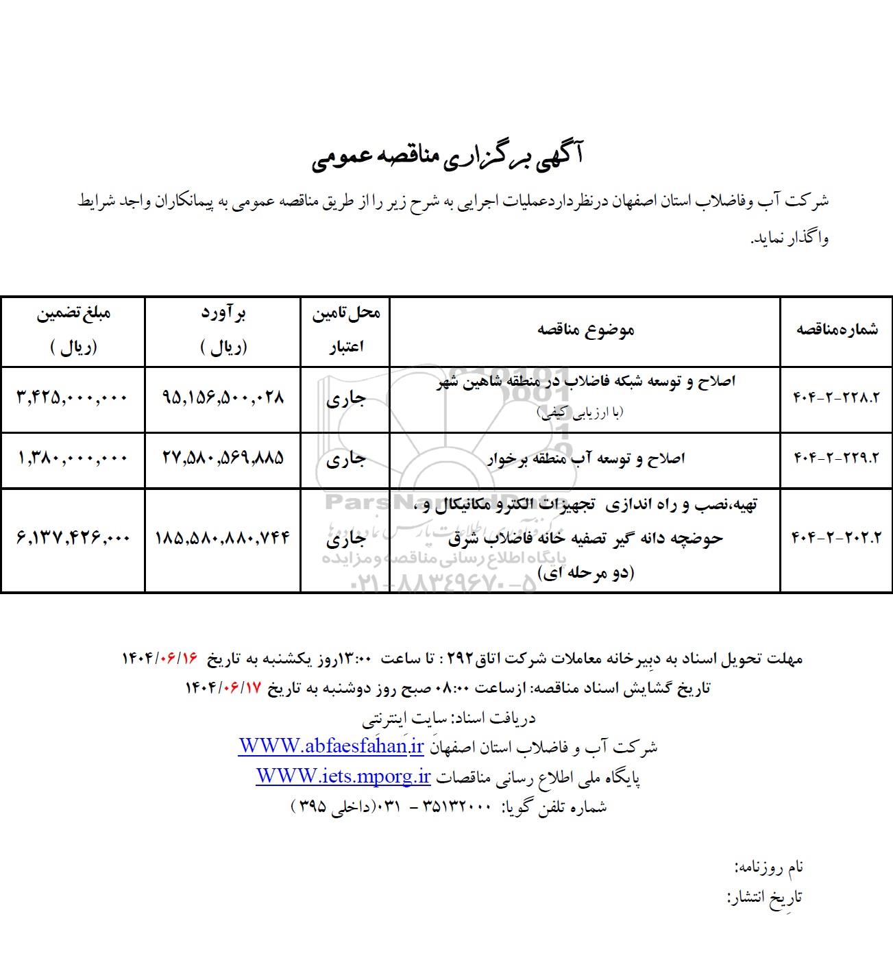 شرکت آب و فاضلاب استان اصفهان در نظر دارد عملیات اجرایی به شرح زیر را از طریق مناقصه عمومی به پیمانکاران واجد شرایط واگذار نماید.