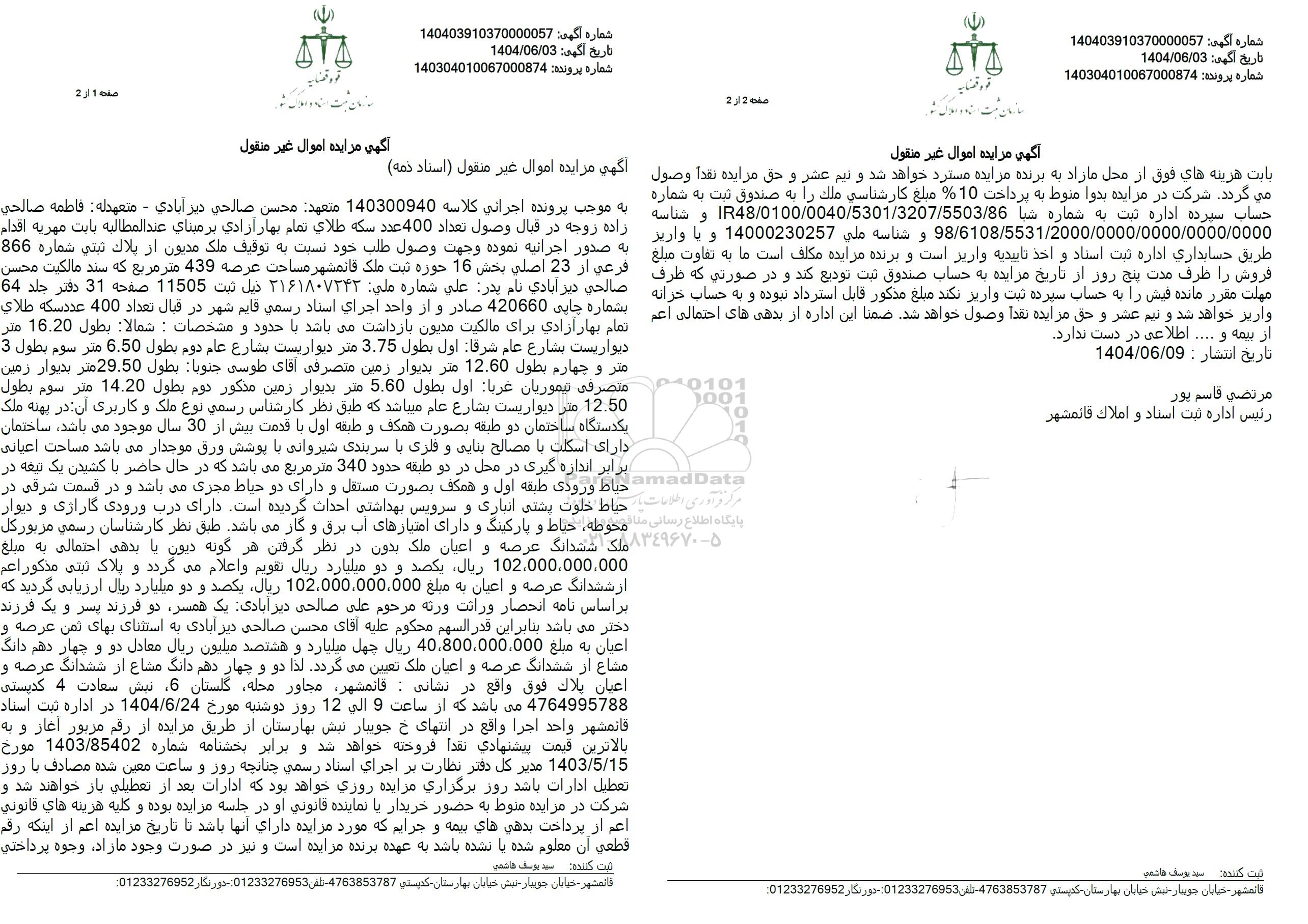 مزایده پلاک ثبتی شماره 866 فرعی از 23 اصلی کلاسه 140300940