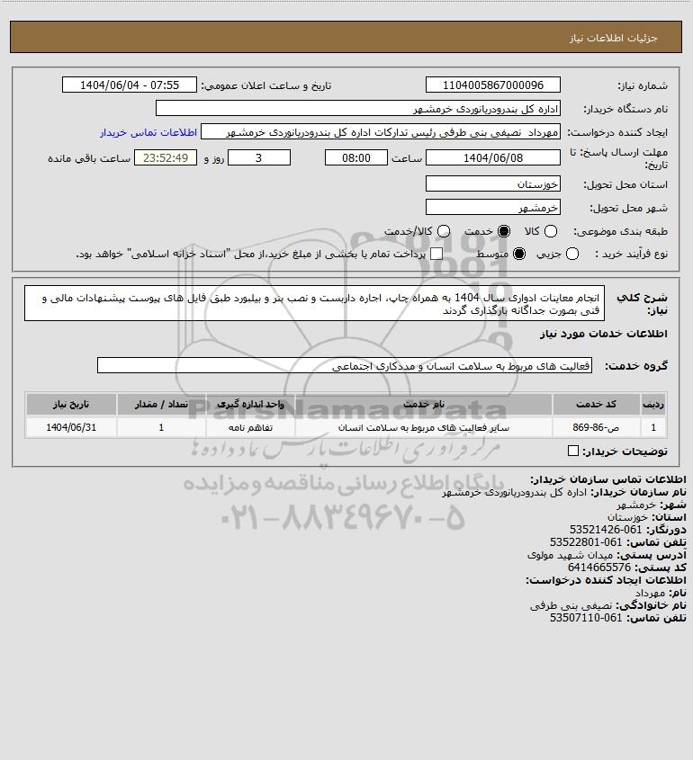 شرح کلی نیاز: انجام معاینات ادواری سال 1404 به همراه چاپ، اجاره داربست و نصب بنر و بیلبورد طبق فایل های پیوست