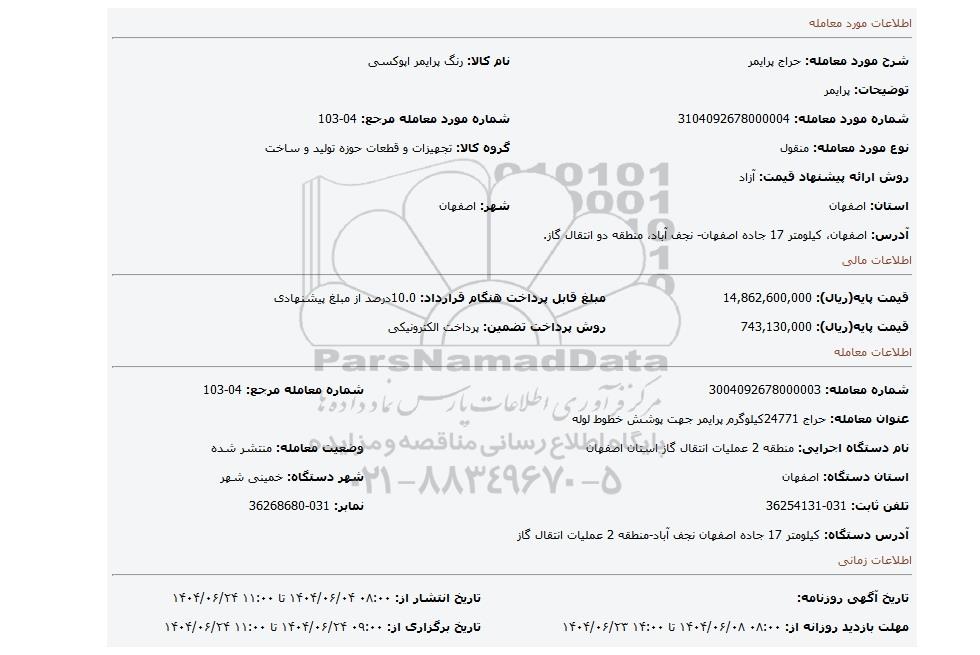 نام دستگاه اجرایی: منطقه 2 عملیات انتقال گاز استان اصفهان | وضعیت معامله: منتشر شده | |