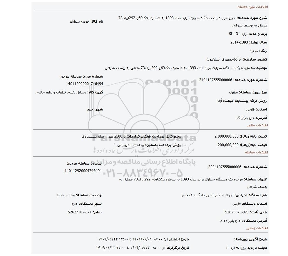 | شرح مورد معامله: حراج مزایده یک دستگاه سواری پراید مدل 1393 به شماره پلاک69ج 292ایران73 متعلق به یوسف شرفی | نام کالا: خودرو سواری | |
