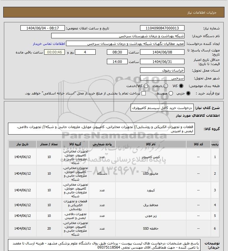 | 1 | -- | کیس کامپیوتر | عدد | تجهیزات مخابراتی، کامپیوتر، موبایل، ملزومات جانبی و شبکه | 10 | 1404/06/12 |