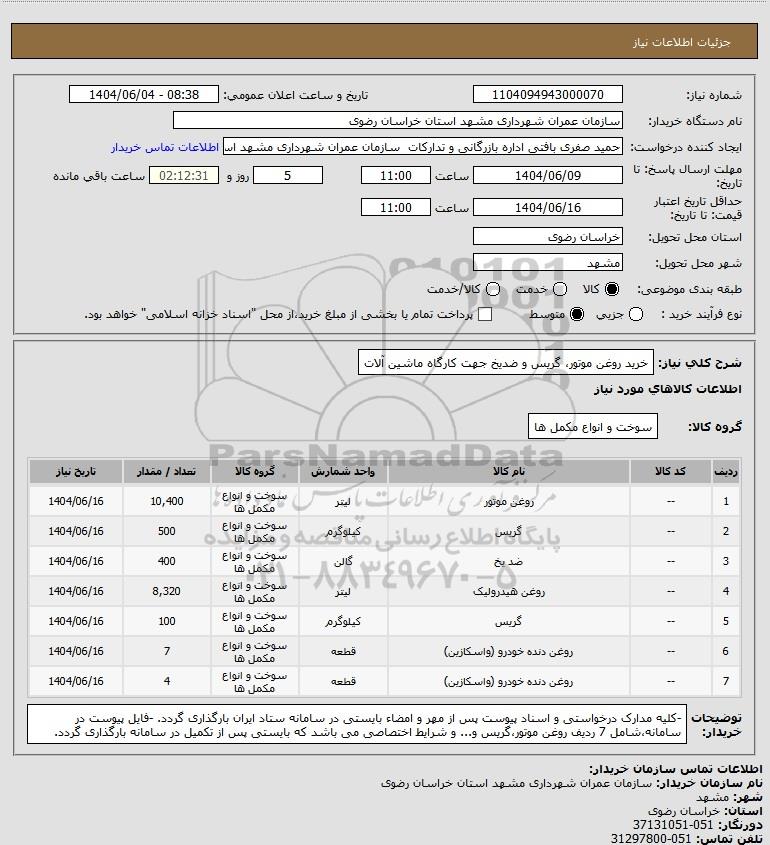 شرح کلی نیاز: خرید روغن موتور، گریس و ضدیخ جهت کارگاه ماشین آلات