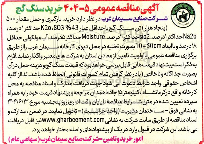 شرکت صنایع سیمان غرب در نظر دارد خرید بارگیری و حمل مقدار 50000 (پنجاه هزار) تن سنگ گچ با حداقل عيار 0343 ، K20 حداکثر 1 درصد Na2o حداکثر درصد sio2 حداکثر 10 درصد Moisture حداکثر 5 درصد آب مولکولی حداقل 18 درصد و با ابعاد 50cm - 110 بصورت تخلیه در محل دپوی کارخانه سیمان غرب را از طریق برگزاری مناقصه عمومی با اولویت تامین از معادن استان به شرکتهای معتبر واگذار نماید. لازم به ذکر است پیشنهاد قیمتهایی قابل بررسی خواهد بود که قیمت سنگ گچ و هزینه حمل در آن بصورت جداگانه و ناخالص ( با در نظر گرفتن تمام کسورات قانونی لحاظ شده باشد. لذا از کلیه اشخاص حقوقی واجد شرایط دعوت میشود جهت دریافت مدارک و اسناد مناقصه به محل کارخانه واقع در کرمانشاه ، کیلومتر 15 جاده همدان مراجعه و پیشنهاد قیمت خود را به همراه سپرده تعیین شده در متن شرایط مناقصه تا پایان وقت اداری روز پنجشنبه مورخ 1404.6.13 به نشانی فوق - ساختمان مدیریت واحد حراست - تحویل نمایند. در ضمن مدارک و اسناد مناقصه از طریق سایت شرکت به نشانی www.gharbcement.com نیز قابل دریافت می باشد. این شرکت در قبول یا رد هر یک از پیشنهادهای واصله مختار خواهد بود.