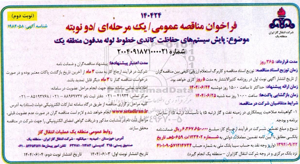 مناقصه عمومی پایش سیستم های حفاظت کاتدی خطوط لوله مدفون منطقه یک - نوبت دوم از کلیه افراد متخصص و شرکتها واجد شرایط دعوت به عمل میآید در مناقصه با کد خبرگزاری پارس نماد: 9455853 شرکت نمایند.