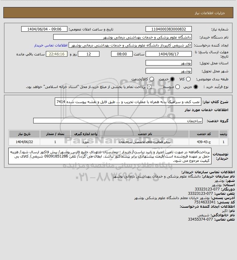 شرح کلی نیاز: نصب کنف و سرامیک بدنه همراه با عملیات تخریب و ... طبق فایل و نقشه پیوست شده 7414