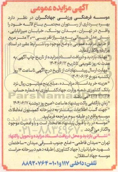 موسسه فرهنگی ورزشی جهادگران در نظر دارد بهره برداری از رستوران مجتمع باغ لاله خود را واقع در تهران میدان پونک خیابان میرزابابایی نبش عدل شمالی به متراژ تقریبی 12,000 متر مربع از طریق مزایده عمومی با وضع موجود و با شرایط مقرر در استاد مزایده واگذار نماید.