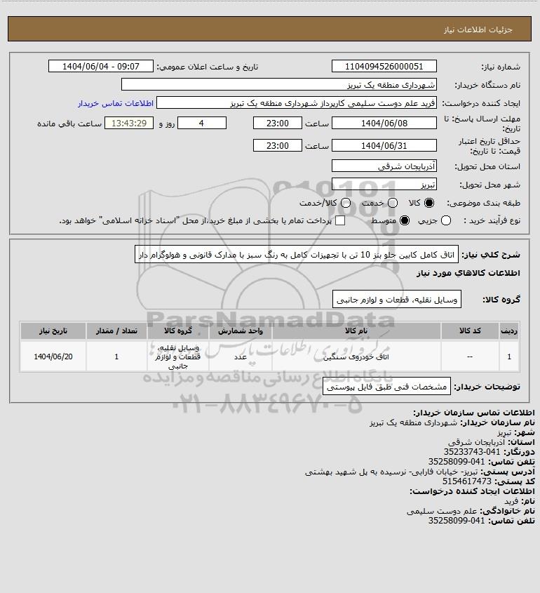 شرح کلی نیاز: اتاق کامل کابین جلو بنز 10 تن با تجهیزات کامل به رنگ سبز با مدارک قانونی و هولوگرام دار