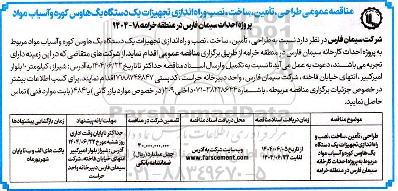 شرکت سیمان فارس در نظر دارد نسبت به طراحی، تامین، ساخت، نصب و راه اندازی تجهیزات یک دستگاه بگ هاوس کوره و آسیاب مواد مربوط به  پروژه احداث کارخانه سیمان فارس در منطقه خرامه، از طریق برگزاری مناقصه عمومی اقدام نماید از شرکتهای متقاضی که در این زمینه دارای تجربه می باشند؛ دعوت به عمل می آید تا نسبت به تکمیل و ارسال مدارک و پیشنهاد قیمت حداکثر تا تاریخ 1404.06.22 به آدرس : شیراز ، کیلومتر 10 بلوار امیرکبیر، انتهای خیابان فاخته شرکت سیمان فارس واحد دبیرخانه حراست ، کدپستی 7188746847 اقدام نمایند. برای کسب اطلاعات بیشتر در خصوص جزئیات برگزاری استعلام مربوطه ، با شماره 38228644-071 داخلی 209 در خصوص موارد بازرگانی یا 484 بابت موارد فنی تماس حاصل نمایید.
