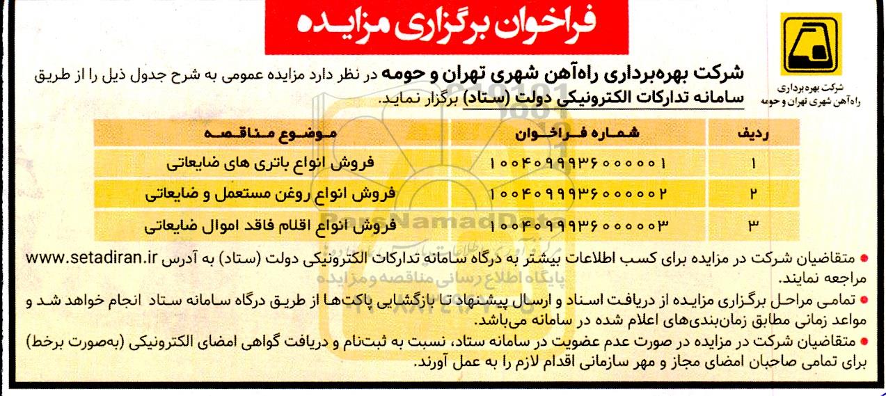 شرکت بهره برداری راه آهن شهری تهران و حومه در نظر دارد مزایده عمومی به شرح جدول ذیل را از طریق سامانه تدارکات الکترونیکی دولت ستاد برگزار نماید.
