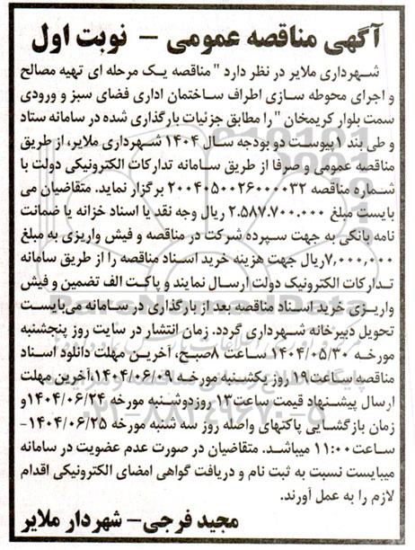 شهرداری ملایر در نظر دارد مناقصه یک مرحله ای تهیه مصالح و اجرای محوطه سازی اطراف ساختمان اداری فضای سبز و ورودی سمت بلوار کریمخان را مطابق جزئیات بارگذاری شده در سامانه ستاد و طی بند 1 پیوست دو بودجه سال 1404 شهرداری ملایر از طریق مناقصه عمومی و صرفا از طریق سامانه تدارکات الکترونیکی دولت با شماره مناقصه 2004050026000032  برگزار نماید. متقاضیان می بایست مبلغ 2.587.700.000 ریال وجه نقد یا اسناد خزانه یا ضمانت نامه بانکی به جهت سپرده شرکت در مناقصه و فیش واریزی به مبلغ 7.000.000 ریال جهت هزینه خرید اسناد مناقصه را از طریق سامانه تدارکات الکترونیک دولت ارسال نمایند و پاکت الف تضمین و فیش واریزی خرید اسناد مناقصه بعد از بارگذاری در سامانه میبایست تحویل دبیرخانه شهرداری گردد زمان انتشار در سایت روز پنجشنبه مورخه 1404.5.30 ساعت 8صبح