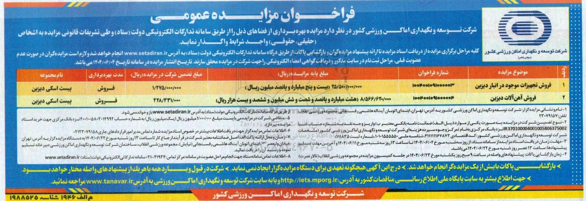 1 | فروش تجهیزات موجود در انبار دیزین | 1004001091000003 | 25.500.000.000 (بیست و پنج میلیارد و پانصد میلیون ریال) |