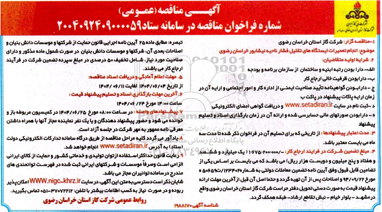 مناقصه انجام تعمیرات ایستگاه های تقلیل فشار, مناقصه انجام تعمیرات ایستگاه های تقلیل فشار