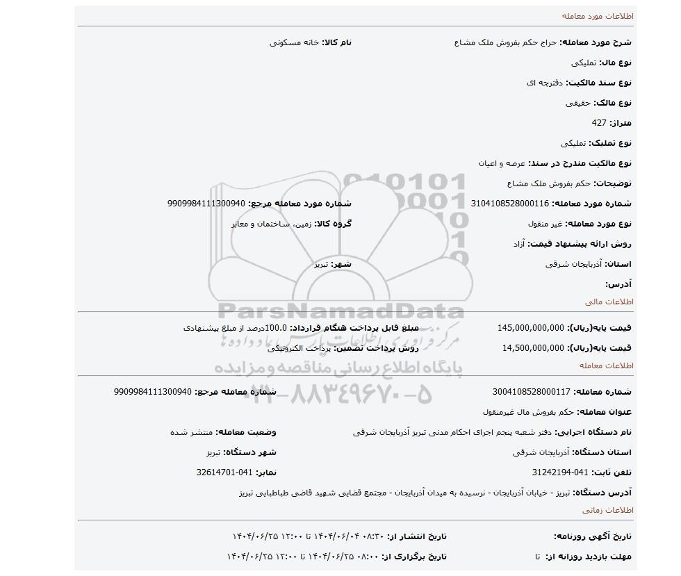 | شماره مورد معامله: 3104108528000116 | شماره مورد معامله مرجع: 9909984111300940 | |