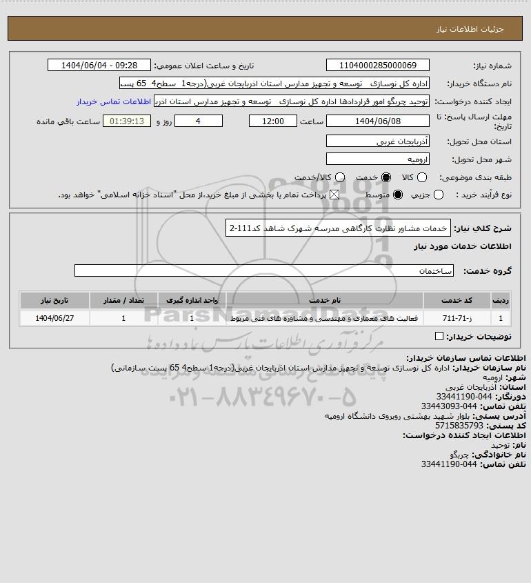 شرح کلی نیاز: خدمات مشاور نظارت کارگاهی مدرسه شهرک شاهد کد111-2