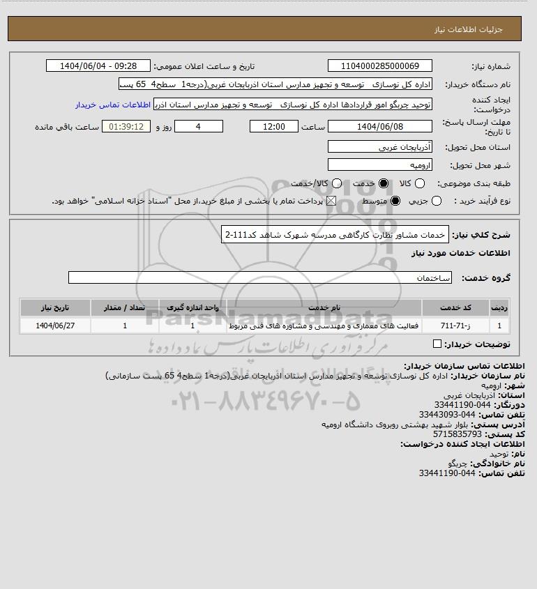 شرح کلی نیاز: خدمات مشاور نظارت کارگاهی مدرسه شهرک شاهد کد111-2