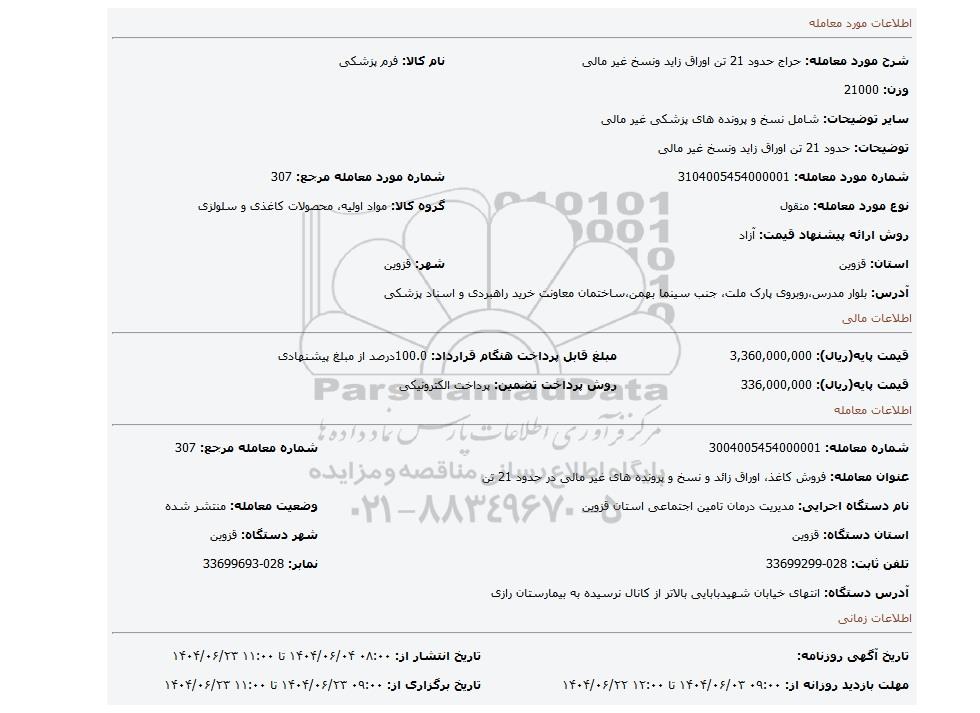 | شرح مورد معامله: حراج حدود 21 تن اوراق زاید ونسخ غیر مالی | نام کالا: فرم پزشکی | |