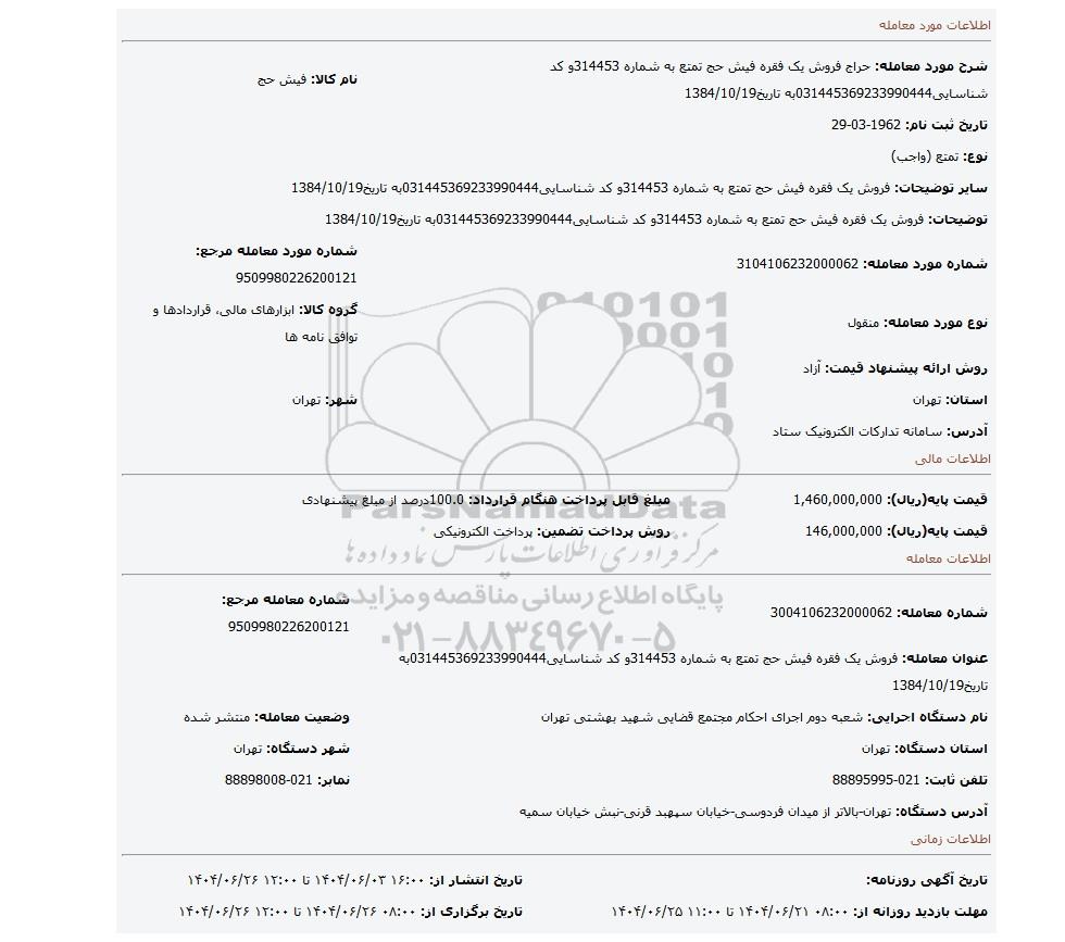 | عنوان معامله: فروش یک فقره فیش حج تمتع به شماره 314453و کد شناسایی031445369233990444به تاریخ1384/10/19 | ||