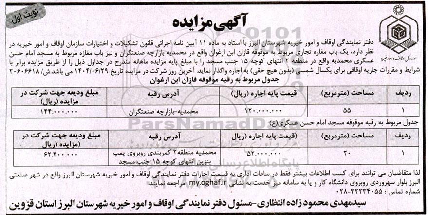 دفتر نمایندگی اوقاف و امور خیریه شهرستان البرز با استاد به ماده 11 آیین نامه اجرائی قانون تشکیلات و اختیارات سازمان اوقاف و امور خیریه در نظر دارد یک باب مغاره تجاری مربوط به موقوفه قازان ابن ارغوان واقع در محمدیه بازارچه صنعتگران و نیز باب مغازه مربوط به مسجد امام حسن اداره کل اوقاف و امور خیری عسگری محمدیه واقع در منطقه 2 انتهای کوچه 15 جنب مسجد را با مبلغ پایه مزایده ماهانه مندرج در جداول ذیل را از طریق مزایده برابر با شرایط و مقررات جاریه اوقافی برای یکسال شمسی بدون هیچ حقی به اجاره واگذار نماید آخرین روز شرکت در مزایده تاریخ 1404.06.29 می باشد.ش. 20606618