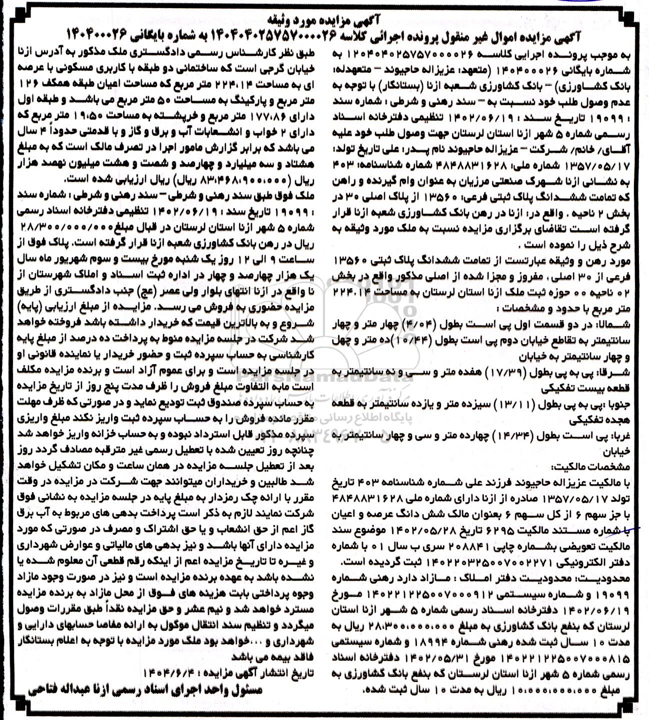 مزایده فروش ملک به مساحت 224.14 مترمربع پلاک ثبتی فرعی 13560 از پلاک اصلی 30