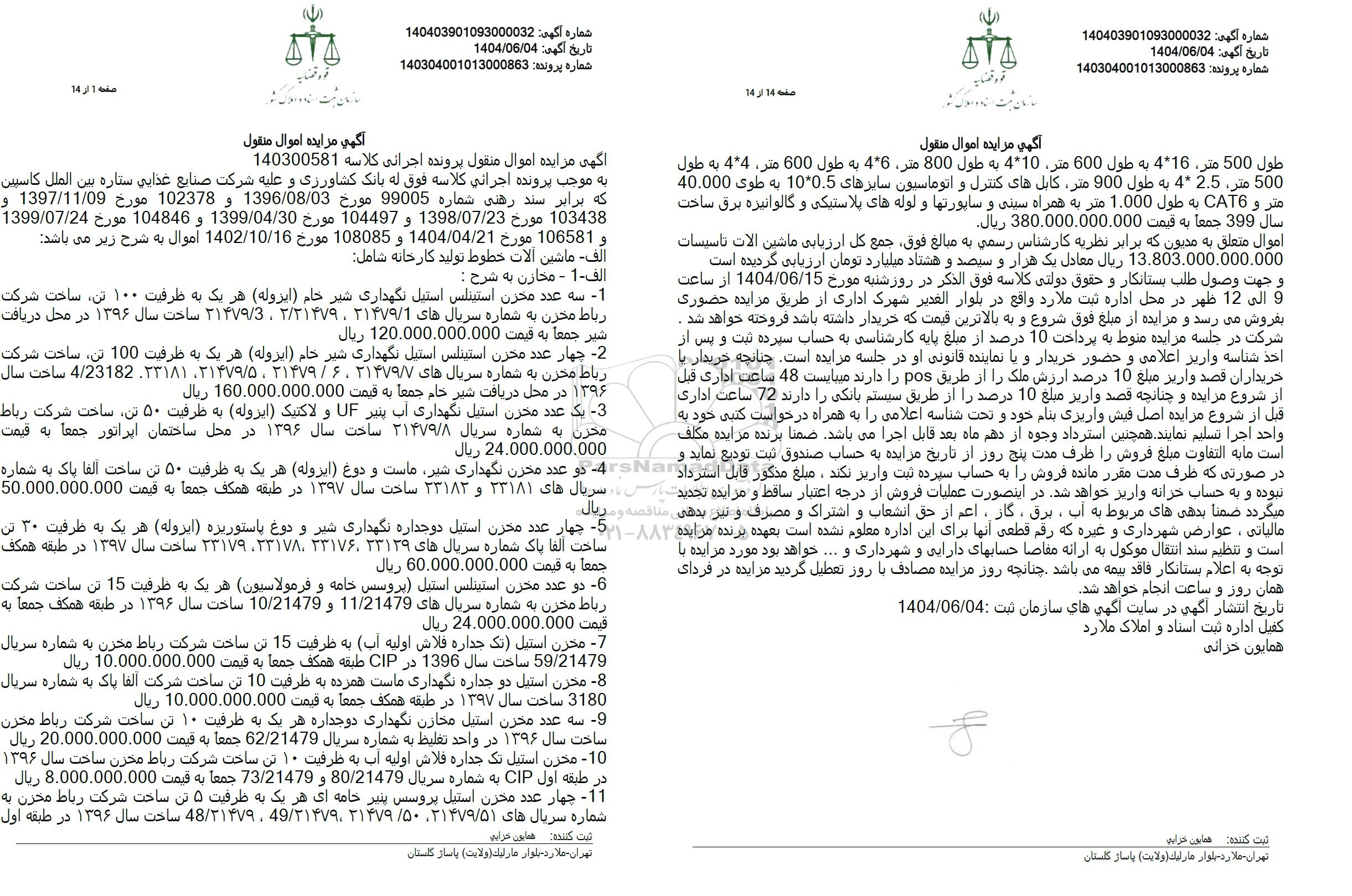 مزایده ماشین آلات خطوط تولید شامل مخازن استنلس استیل ................. و غیره .....