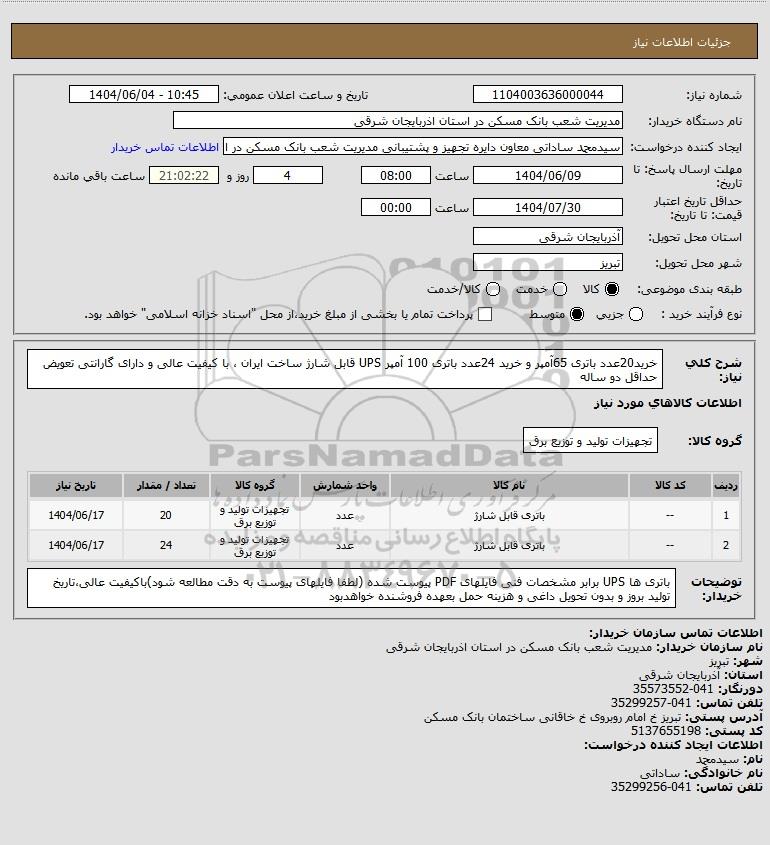| 1 | -- | باتری قابل شارژ | عدد | تجهیزات تولید و توزیع برق | 20 | 1404/06/17 |