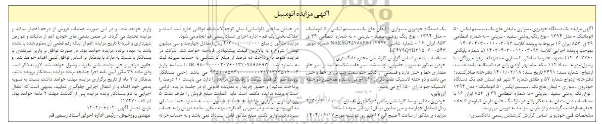 مزایده فروش یک دستگاه خودروی سواری لیفان هاچ بک سیستم ایکس 50, مزایده فروش یک دستگاه خودروی سواری لیفان هاچ بک سیستم ایکس 50