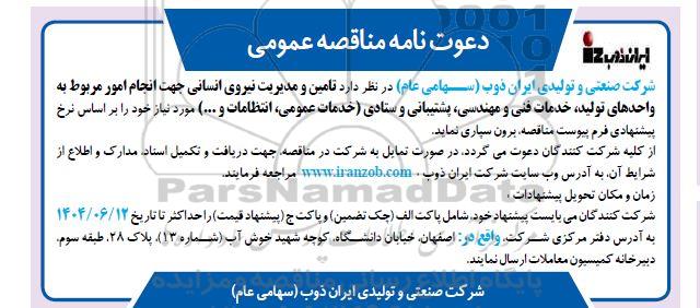 شرکت صنعتی و تولیدی ایران ذوب (سهامی عام) در نظر دارد تامین و مدیریت نیروی انسانی جهت انجام امور مربوط به واحدهای تولید، خدمات فنی و مهندسی، پشتیبانی و ستادی ( خدمات عمومی، انتظامات و...) مورد نیاز خود را بر اساس نرخ پیشنهادی فرم پیوست مناقصه، برون سپاری نماید.
