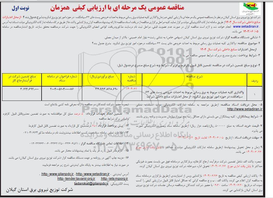 | 1 | واگذاری کلیه عملیات برق رسانی مربوط به احداث خروجی پست های 63 سیاهکلده در حوزه امور توزیع برق لنگرود - از محل اعتبارات منابع داخلی شرکت | 67 - 1404 | 33.993.828.690 | 2004005104000086 | 3.124.692.000 |