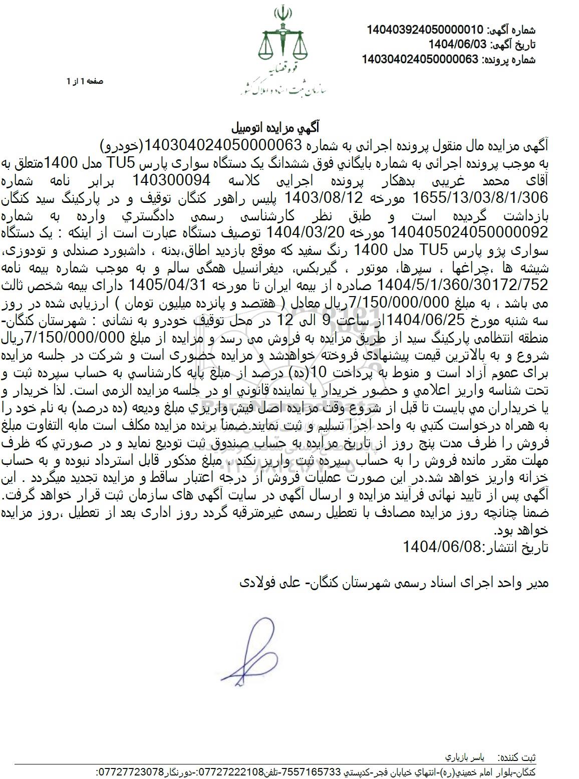 ششدانگ یک دستگاه سواری پارس TU5 مدل 1400 رنگ سفید به ارزش 7.150.000.000 ریال