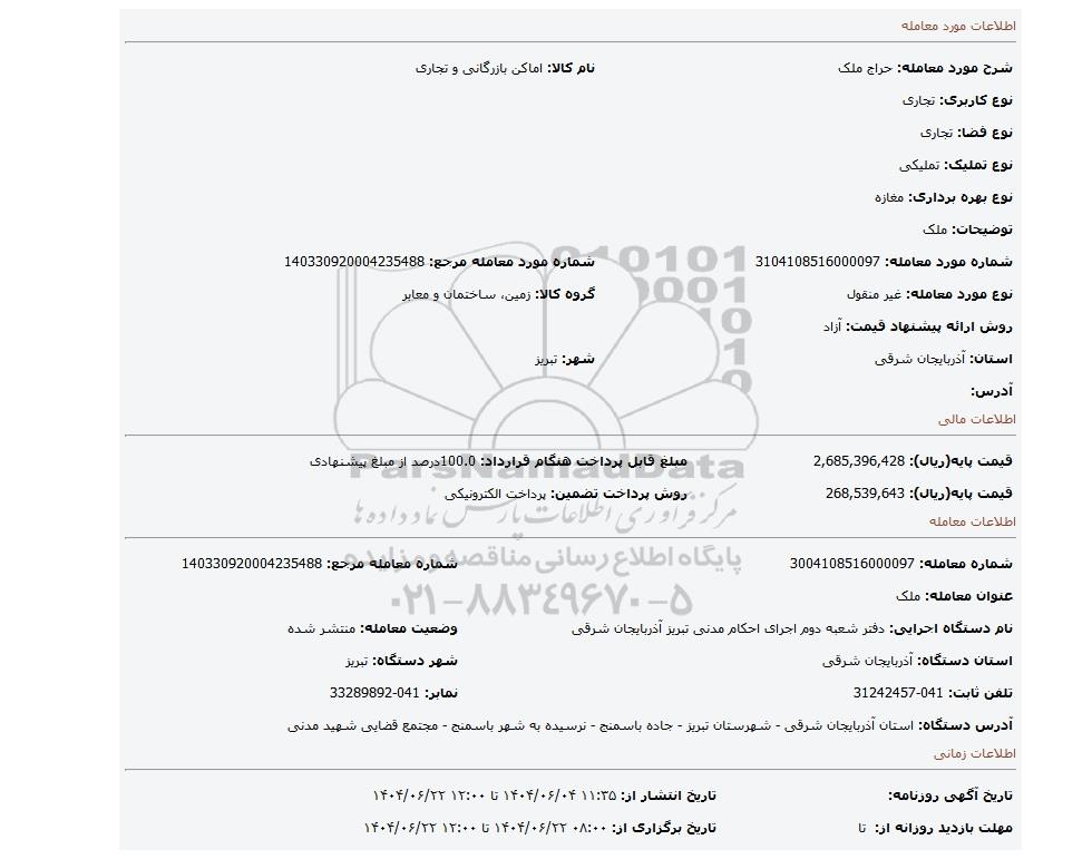 | شرح مورد معامله: حراج ملک | نام کالا: اماکن بازرگانی و تجاری | |