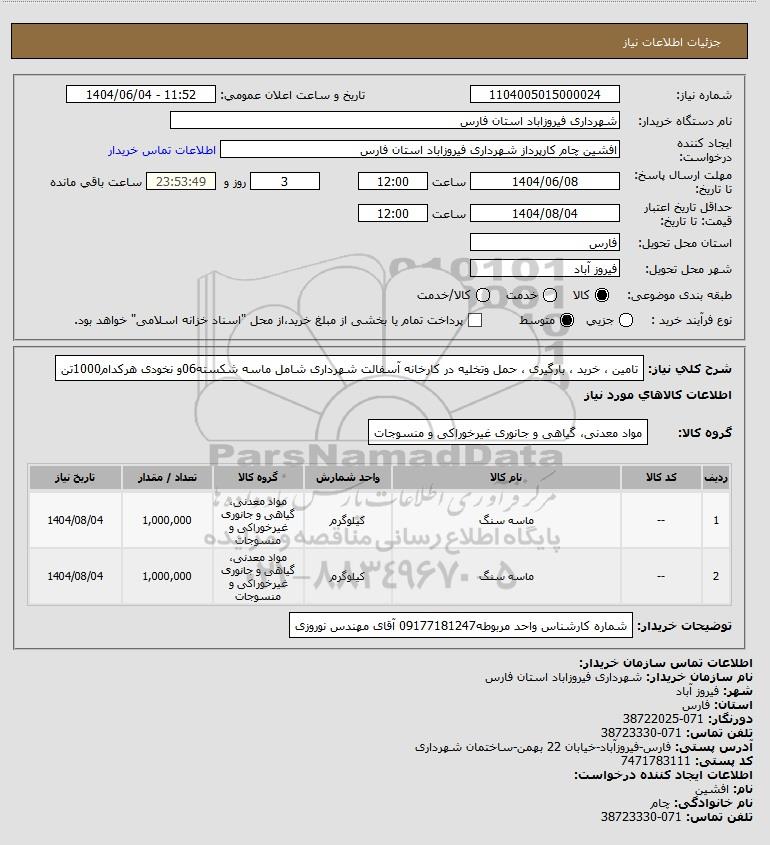 شرح کلی نیاز: تامین ، خرید ، بارگیری ، حمل وتخلیه در کارخانه آسفالت شهرداری شامل ماسه