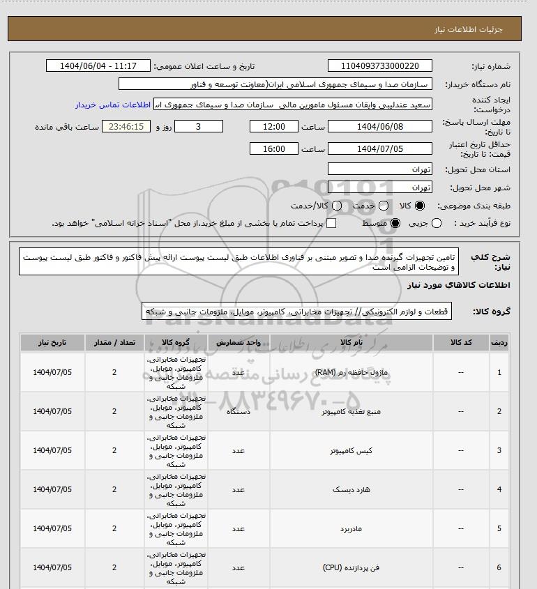 شرح کلی نیاز: تامین تجهیزات گیرنده صدا و تصویر مبتنی بر فناوری اطلاعات طبق لیست پیوست ارائه پیش فاکتور و فاکتور طبق لیست پیوست و توضیحات الزامی است