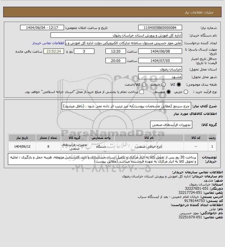 شرح کلی نیاز: چرخ سردوز (مطابق مشخصات پیوست)به غیر ترتیب اثر داده نمی شود . (باطل میشود)